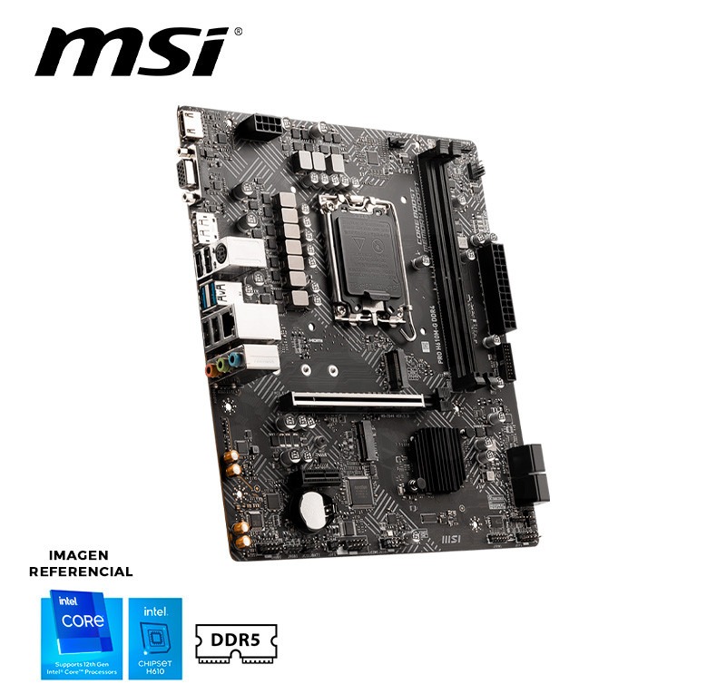 Mainboard MSI PRO H610M-G, DDR5, LGA 1700, compatible con Intel Core 14ª/13ª/12ª gen, Pentium Gold y Celeron. Chipset Intel H610, doble canal DDR5 hasta 96 GB, LAN 1 Gbps, puertos USB 2.0 y 5 Gbps, soporte Windows 10/11 64 bits, formato mATX.